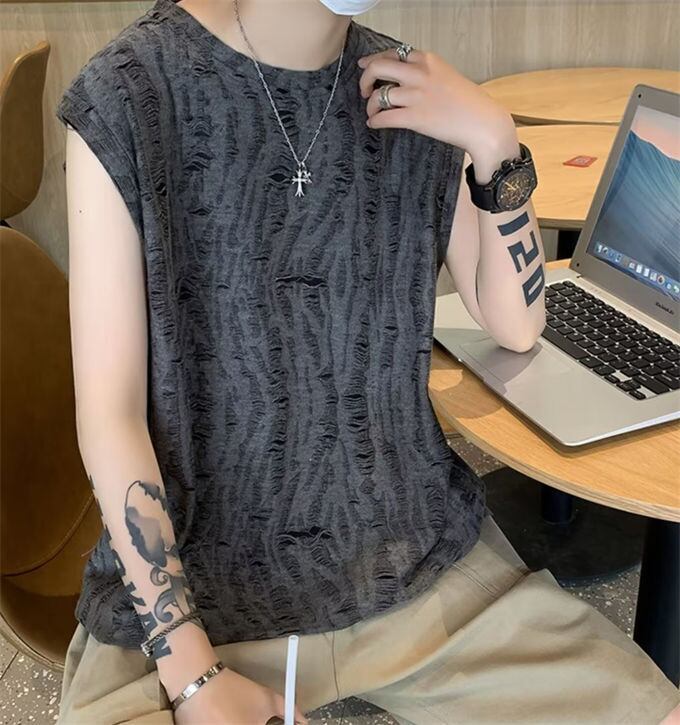 タンクトップ メンズ ノースリーブtシャツ 透かし彫り ダメージ加工 筋トレ おしゃれ トレーニングウェア スポーツウェア フィットネス ヨガウェア ランニングウェア ジムウェア 運動 サーファー ストリート スケーター ヒップホップ 韓国 ファッション 夏 送料無料