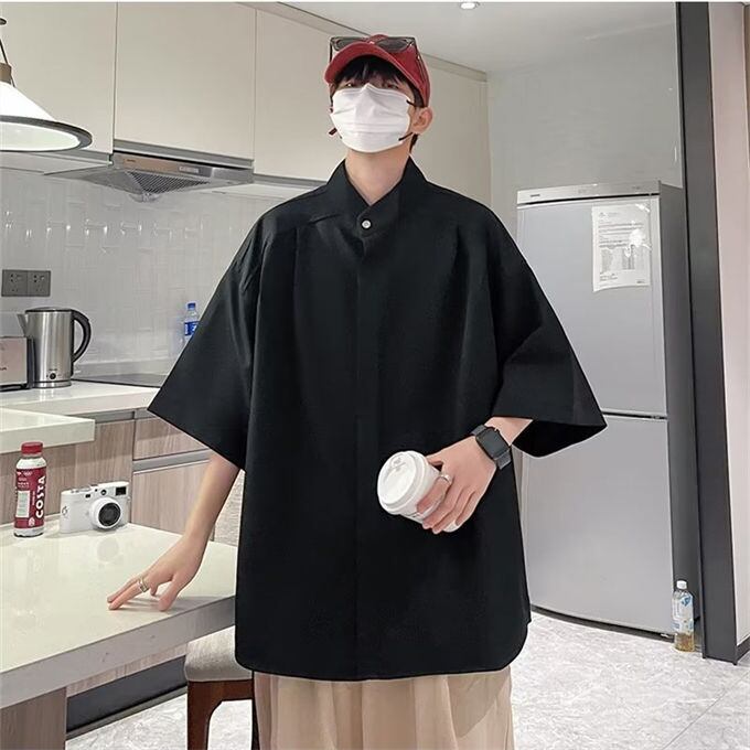 シャツ メンズ 半袖 半袖シャツ 五分袖 チャイナ風 大きいサイズ おしゃれ カジュアルシャツ スタンドカラーシャツ 夏 オーバーサイズ シンプル 無地 清涼感 オシャレ カジュアル メンズファッション 夏服 ブラック ホワイト 送料無料