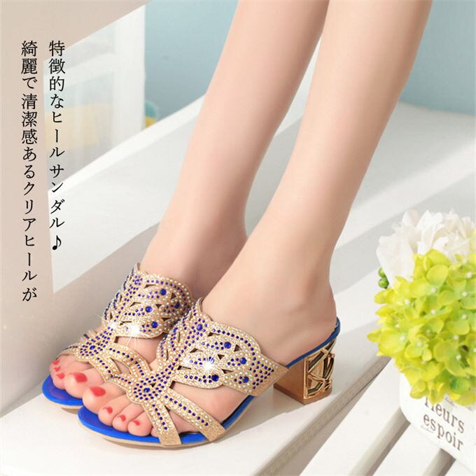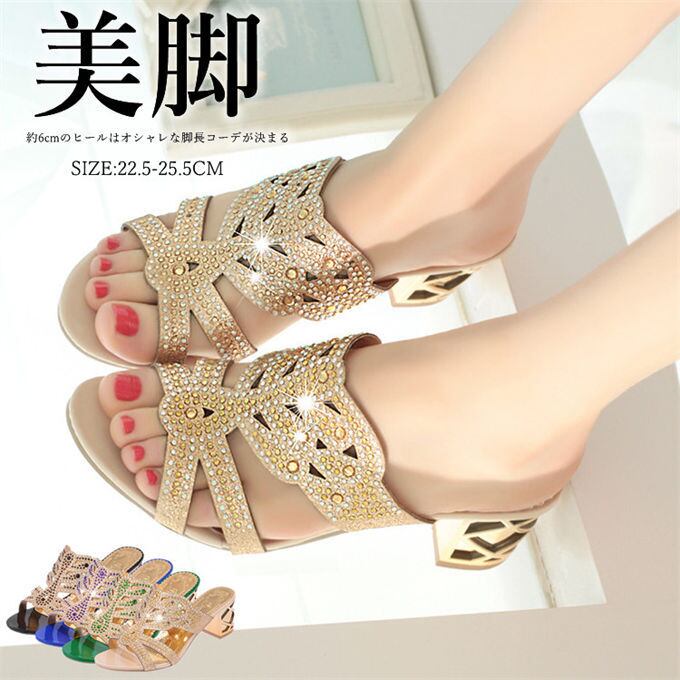 ミュール サンダル レディース 靴 ハイヒール 太めヒール ブーツサンダル ラインストーン飾り キラキラ 通気性 痛くない 歩きやすい おしゃれ キレイめ 通勤 オフィス 美脚 お洒落 夏物 サンダル レディース ミュール ラウンドトゥ 6cm ヒール ブラック 黒 グリーン ブルー 送料無料