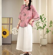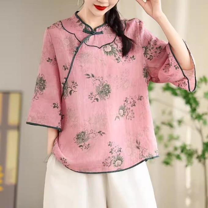 シャツブラウス レディース トップス フレア 半袖 五分袖 七分袖 プリント 花柄 リネン風ブラウス チャイナブラウス チャイナボタン 斜めボタン 花柄ブラウス ゆったり 大きいサイズ カジュアル おしゃれ 通勤 OL お洒落 レトロ 上品 大人 可愛い 服 夏 シャツブラウス レディース トップス チャイナ風 プルオーバー エスニック 七分袖 プリント 花柄ブラウス ゆったり 大きいサイズ トップス オフィス カジュアル 夏物 送料無料