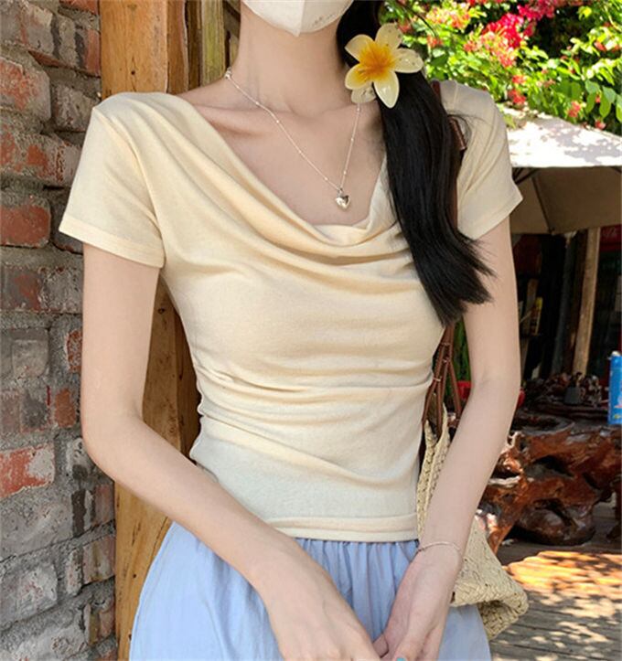 Tシャツ ボートネック レディース 半袖 トップス ショート丈 フリル 仕事 オフィス 女性 夏 プルオーバー 無地 ゆったり ストレッチ 伸縮 シンプル 可愛い コーデ セクシー 通勤 通学 きれいめカジュアル 細見え 韓国ファッション 送料無料