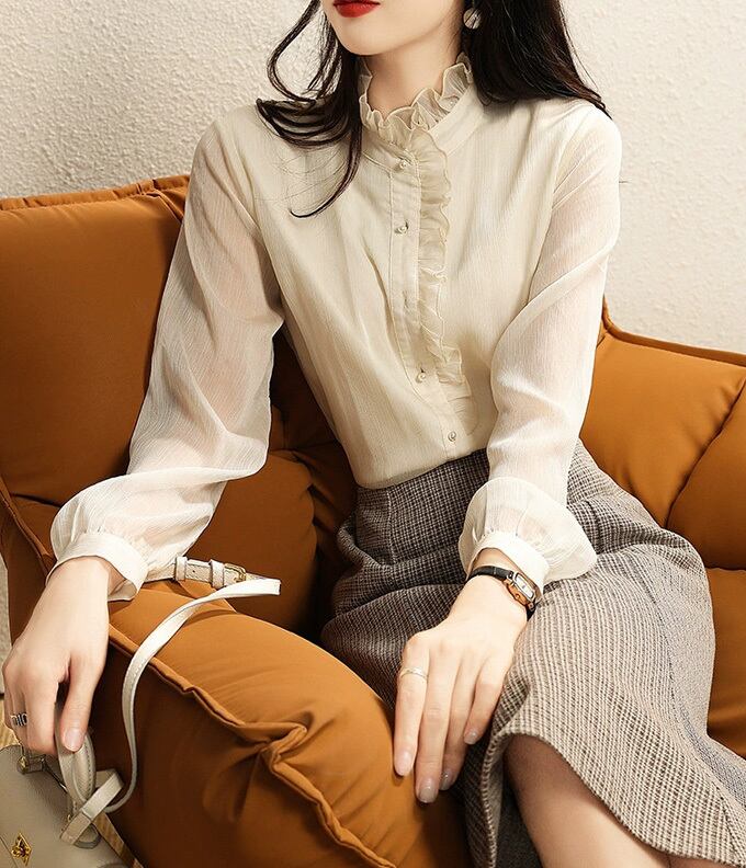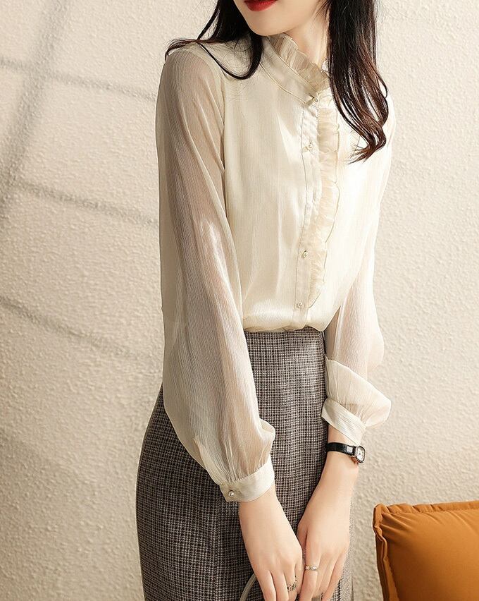シフォンシャツ レディース 長袖シャツ スタンドカラー 透け感 ブラウス 前開き パールボタン フリルネック かわいい カジュアル ゆったりトップス 体型カバー 大きいサイズ 20代 30代 40代 50代 おしゃれ 通勤 通学 秋 秋服 パールボタン シャツ 長袖 スタンドカラーシャツ ブラウス レディース 透け感シアーが大人可愛い トップス 送料無料