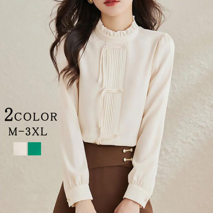 シフォンシャツ レディース 長袖 シャツブラウス スタンドカラー チャイナ風 ブラウス パール付き フリルネック かわいい カジュアル ゆったりトップス 体型カバー 大きいサイズ 20代 30代 40代 50代 おしゃれ オフィス 通勤 秋 秋服 送料無料