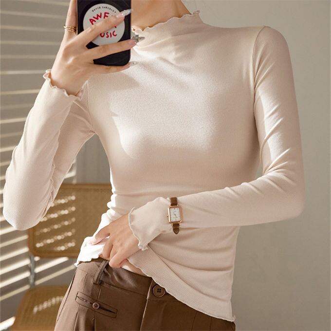 Tシャツ カットソー レディース タートルネック リブ トップス 長袖tシャツ フリル プルオーバー 無地 部屋着 シンプル おしゃれ シンプル タイト セクシー ストレッチ スリム カジュアル 細身 インナー 韓国ファッション 春服 春夏 秋服 冬 冬服 送料無料