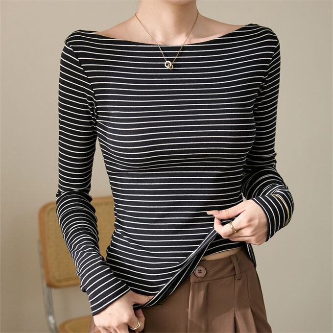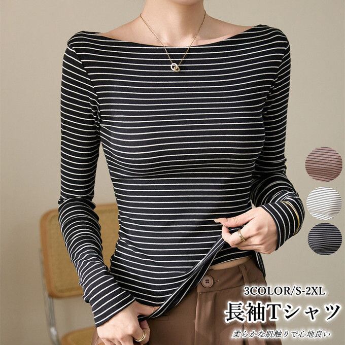 長袖Tシャツ レディース ボートネック トップス ロンT ボーダー柄 プルオーバー コットン おしゃれ かわいい シンプル タイト セクシー ストレッチ スリム カジュアル リラックス インナー 柔らかい オフィス 通勤 OL スリム 細身 韓国ファッション 秋服 冬 冬服 送料無料