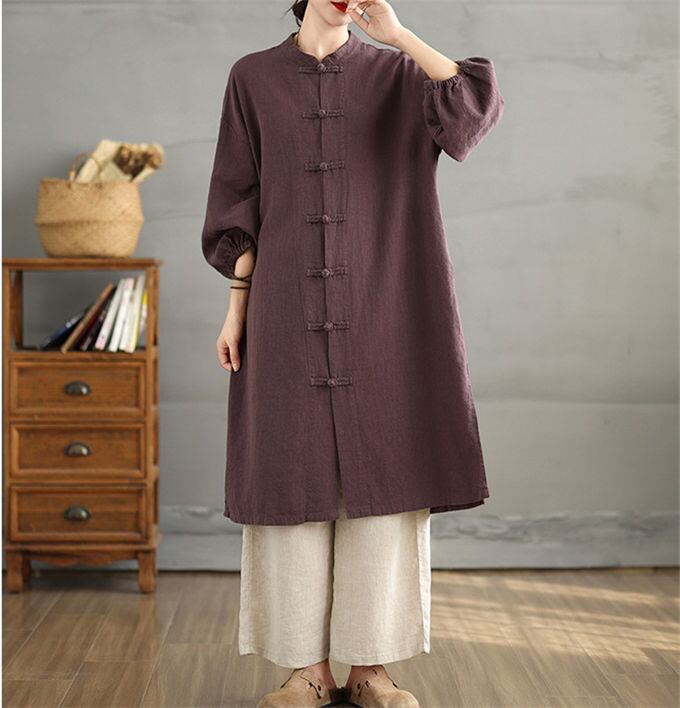 シャツブラウス ボタンシャツ オーバーサイズ 長袖 ノーカラー トップス レディース リネンブラウス 綿麻シャツ ボタン ロング丈 体型カバー ゆったり 羽織 ネルシャツ ガウンシャツ レンチコート おしゃれ エレガント レトロ 通勤 通学 秋 秋服 送料無料