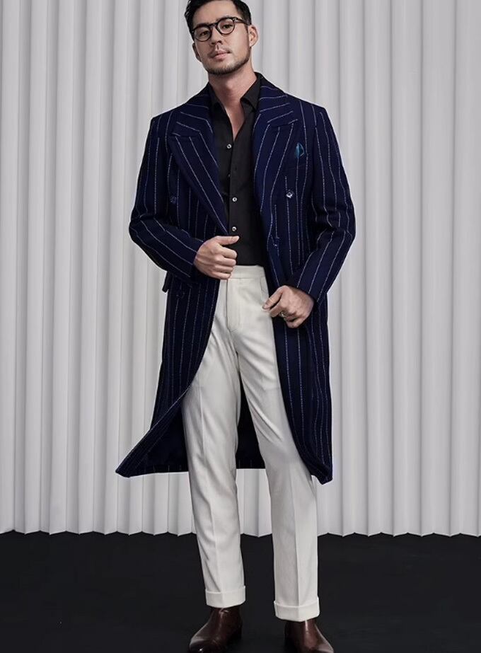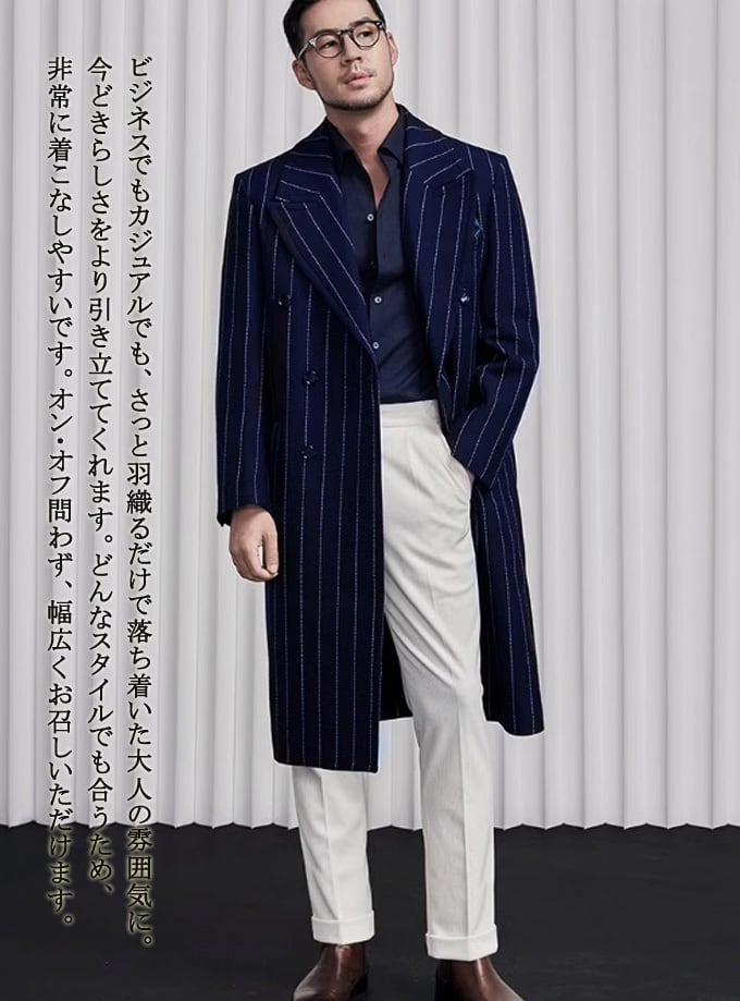 【キーワード】 メンズ (男性用・紳士用) スーツコート メンズウールコート ロングコートメンズ ビジネスコート ビジネススタイル モードスタイル 細身 スリム お洒落 おしゃれコート チェスターコート 上品 高級ウールコート 通勤 ストライプ ストライプ柄 秋冬 あったか ダブルボタン 大人カジュアル 暖かい 真冬 防寒性 通勤 スーツ コート クラシック 伝統的 トレンド 最旬 流行 ウール 30代 40代 50代 60代