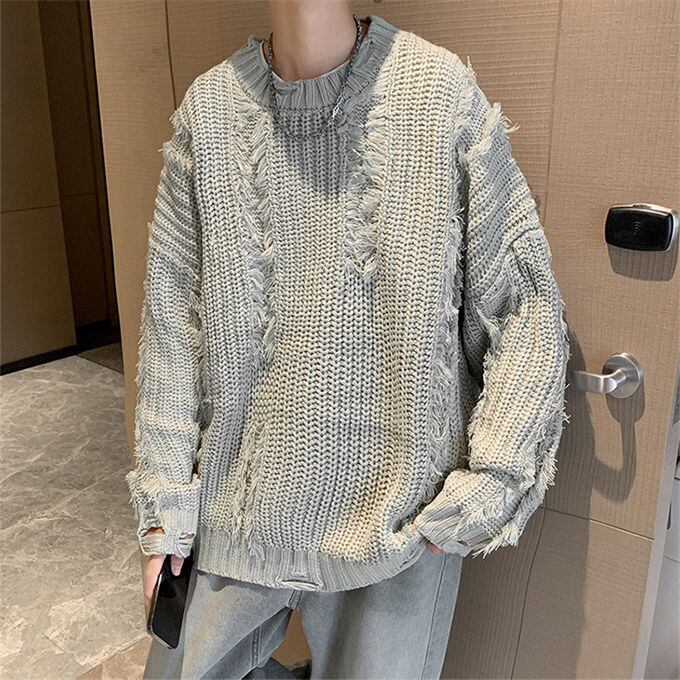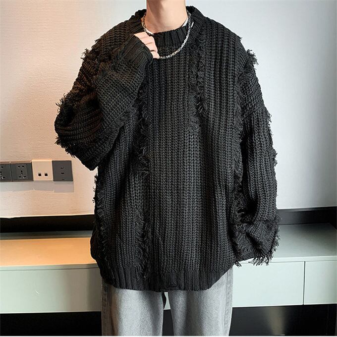 ニット メンズ セーター 大きいサイズ おしゃれ シンプル 無地 クルーネック フリンジ メッシュ 透かし編み 透け感 ビッグシルエット ヒップホップ 20代 30代 40代 男性 男 服 秋 冬 秋冬 韓国ファッション 送料無料