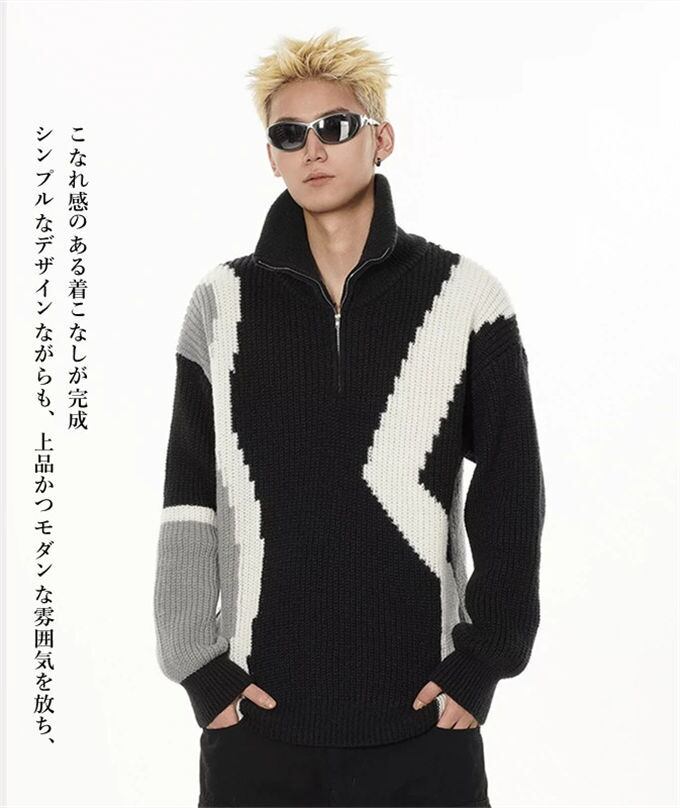 ニット メンズ 秋冬 ニット ハーフジップ プルオーバー オーバーサイズ 切り替え 大きめ カジュアル ビッグニット ビッグシルエット モード 韓国ファッション ストリート ゆったり 防寒 厚手 あったか 暖かい かっこいい 春 秋 冬 秋服 冬服 送料無料
