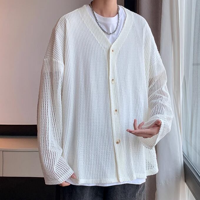 カーディガン メッシュ編み 透かし編み Vネック メンズ シンプル カジュアル ゆったり 無地 薄手 通気性 ニット ビッグシルエット トップス 春 秋 新作 送料無料