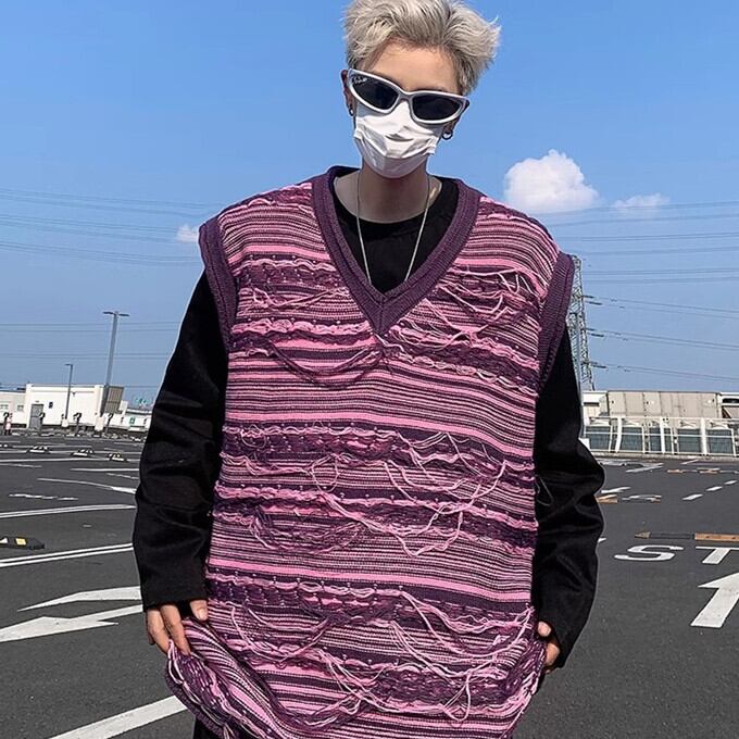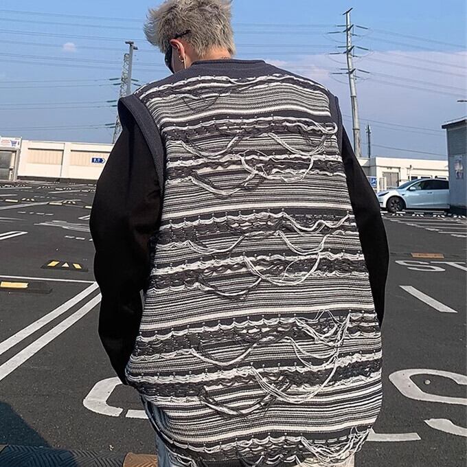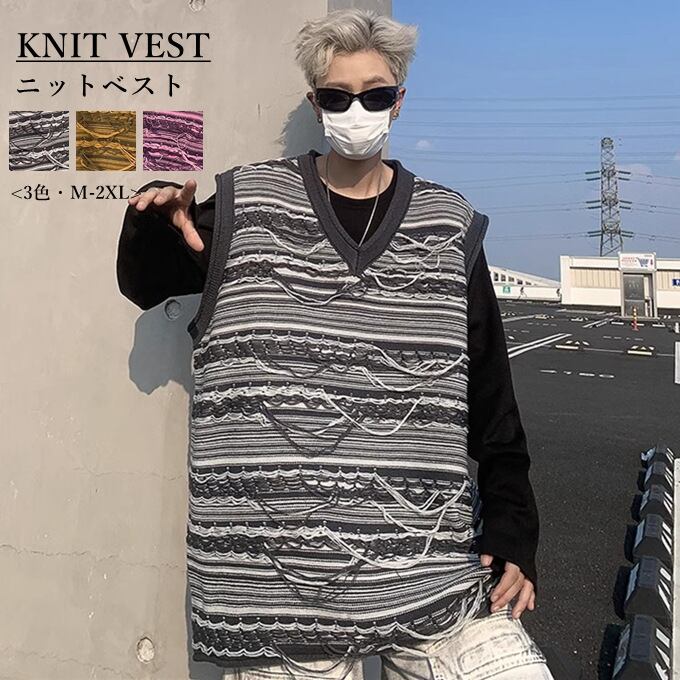 ニットベスト メンズ Vネック フリンジ 厚手 ショート丈 ニット セーター ノースリーブ ゆったり ボーダー トップス アウター 暖かい 防寒 おしゃれ かっこいい 重ね着 カジュアル 韓国ファッション 秋 冬 秋服 冬服 送料無料